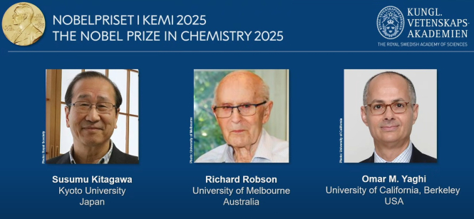 - Сусуму Китагава од Универзитетот во Кјото, Ричард Робсон од Универзитетот во Мелбурн и Омар М. Јаги од Универзитетот Беркли се добитници на овогодинешната награда за хемија за нивното „развивање на метало-органски рамки“.