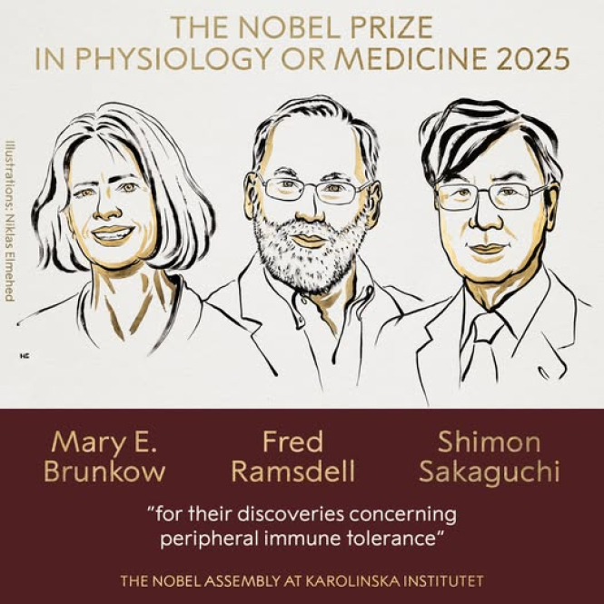 - Денес, 06.10., беа соопштени добитниците на Нобеловата награда за физиологија или медицина за 2025 година. Таа им се доделува на Мери Е. Бранкоу, Фред Рамсдел и Шимон Сакагучи „за нивните откритија во врска со периферната имунолошка толеранција“.