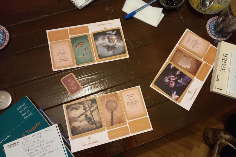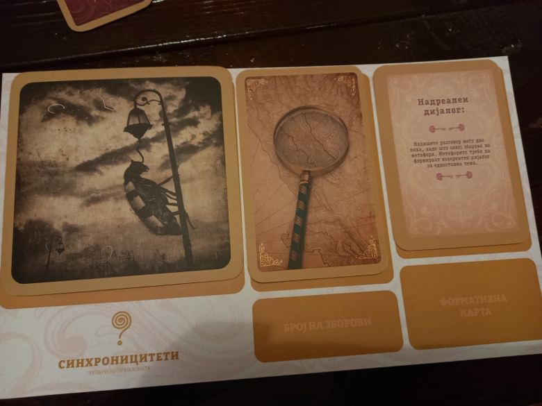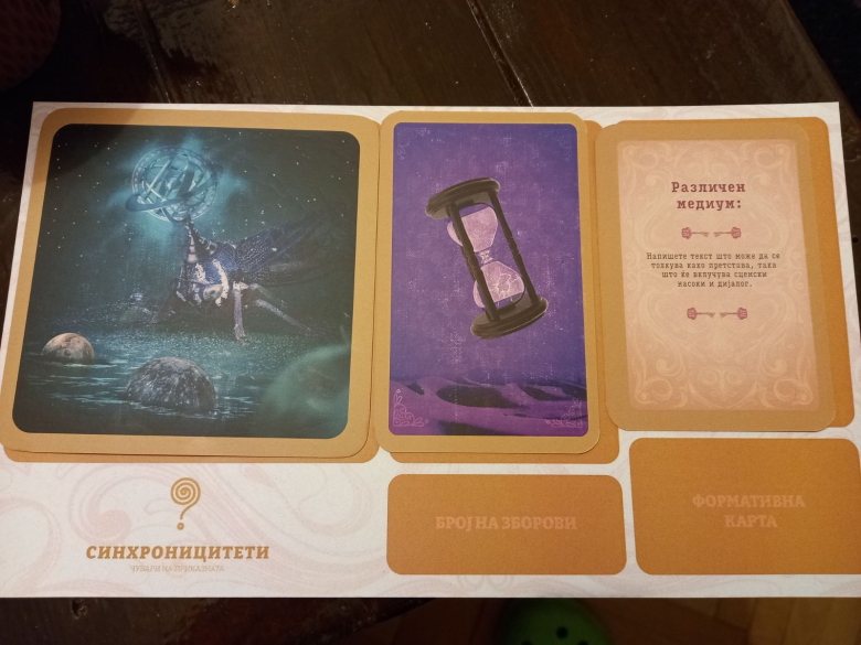 За и овој осврт да не испадне не-осврт, да поедноставиме. Во кутијата за „Синхроницитети“ има неколку видови прекрасно изработни карти. Според упатството, можни се 135.000 нивни комбинации. Шпилот „Синхроницитети“ го означува потенцијалниот лик во приказната (или инспирацијата за него). Вториот е со архетипски предмети, кои можат да се сфатат буквално но и метафорично (на пример лупа, огледало со пајажина, шешир). Третиот е „Предизвици“, кој го одредува стилот или задачата, на пример пишување исклучиво во дијалог или со тоа секоја реченица да почнува на одредена буква. На крај, има коцки, чие вртење го одредува бројот на зборови (за пократки дела можат да се користат помал број коцки). Може да се пишува проза, поезија или хибриден текст, со тоа што најдобро функционира ако сите пишуваат во ист жанр, за предизвикот да е изедначен.