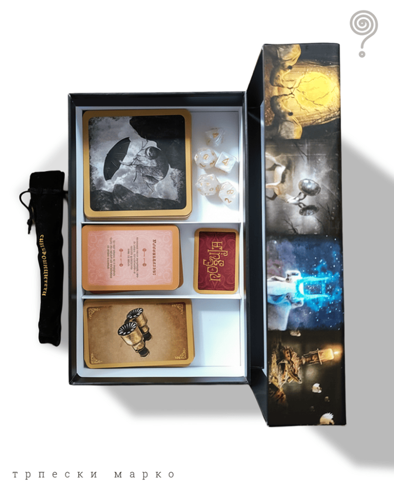 Одамна имав слушнато за „Синхроницитети: чувари на приказната“ на визуелниот уметник Марко Трпески. Но описите за неа беа некако „суви“ и неодредени - „артикулација на потсвесни текови“, „натпревар со самиот себе“ - доволно за да заличи на некаква тренди алатка за самопомош и со тоа постојано да се наоѓа на опашката на приоритетите. До моментот кога окото, во последно време навикнато не да шета по туѓите полици скенирајќи ги книгите, туку проверувајќи дали домаќинот има друштвени игри и кои - не забележа шарена кутија некаде во висините.