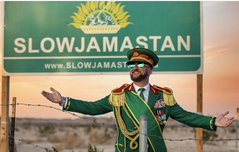 Некаде помеѓу палмините насади на долината Коачела и мексиканската граница, на сув и на прв поглед безначаен предел, се наоѓа Републиката Слоуџамастан – најмладата „држава“ во светот. Распространета на пустинско земјиште во величина на околу 7 фудбалски стадиони, таа изгледа како место покрај кое би поминале без да забележите ништо. Но ако застанете, влегувате во паралелна реалност: тука се забранети крокси (оние глупите пластични налани), масовни „риплај-ол“ мејлови, а брзото возење е дозволено - но само ако брзате дома затоа што сте гладни. Националното животно е ракунот.