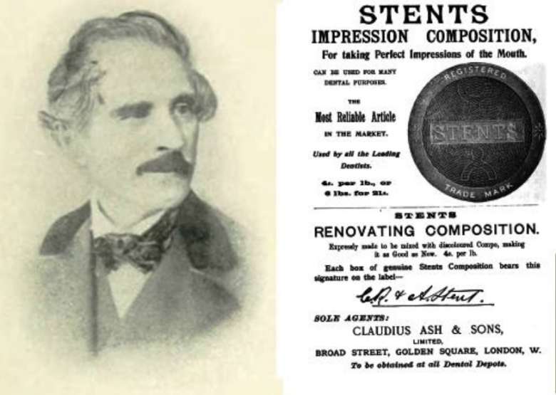 Потеклото на зборот има врска со конкретен човек, со англискиот стоматолог Чарлс Томас Стент. Во средината на 19 век, тој развил подобрена маса за земање отпечатоци во стоматологијата. На дотогаш користената „гутаперча“ (природен, термопластичен и биокомпатибилен материјал добиен од латекс на југоисточно азиски дрвја) тој додал состојка подоцна наречена „Стентова“, која ги подобрувала својствата и оттаму брзо се проширила во стоматолошката практика.