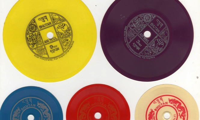 Во 1972 година, Кралството Бутан направило нешто што дотогаш никому не му текнало: серија поштенски марки изработени од пластика, кои всушност се минијатурни винил-плочи. Станува збор за седум еднострани марки што се вртат со 33 1/3 вртежи во минута и можат да се пуштат на обичен грамофон. Доволно било да се одлепи задната хартија и марката да се залепи на плик или разгледница. На нив имало снимки од бутански народни песни, химната на државата, како и кратки историски прегледи на англиски и на џонгка, локалниот јазик.