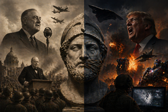Начинот на кој политичарите зборуваат за војна отсекогаш откривал многу повеќе од самата воена стратегија - тој покажува какви вредности сакаат да одбранат и каква слика за светот нудат на своите граѓани. Некогаш лидерите ја оправдувале војната со зборови за мир, слобода и достоинство. Денес, сè почесто, сериозните говори се заменуваат со груб јазик, филмски цитати и агресивни пораки што повеќе личат на сцени од акционен блокбастер отколку на државничка реторика.