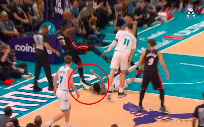 Bam Adebayo falls hard and walks gingerly to the locker room after LaMelo Ball grabs his foot while in mid-air, swinging it (with replays) pic.twitter.com/bI3gC13xKk