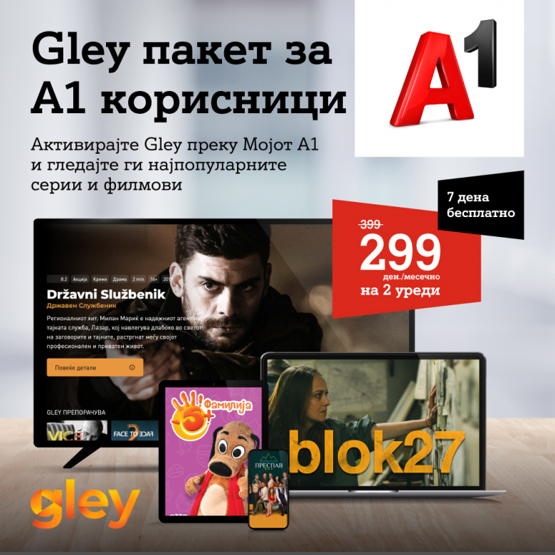 А1 Македонија со задоволство ја најавува најновата соработка со првата македонска национална видео-стриминг платформа Gley и ја информира јавноста дека отвара уште една можност за своите корисници да пристапат до богат избор на домашни, регионални и светски филмови и серии на едно место, сите преведени на македонски и албански јазик.