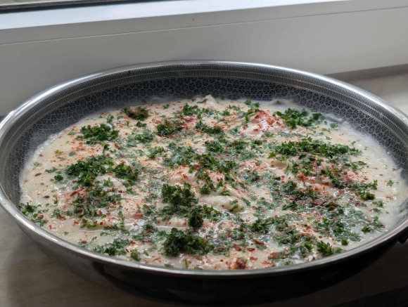 Бојадисуваме со ситно сецкан магдонос и буковец. Резултатот е царски: бел, мирен, миризлив и некако целосен. Риба што не бара ништо и сос што го прифаќа тоа. Може и вино. Бело!