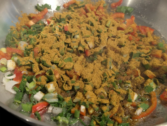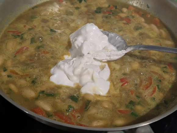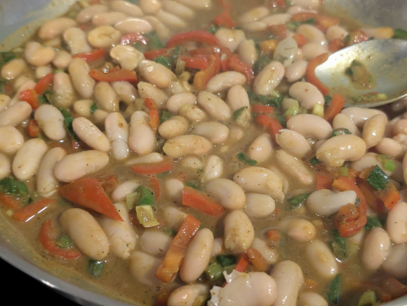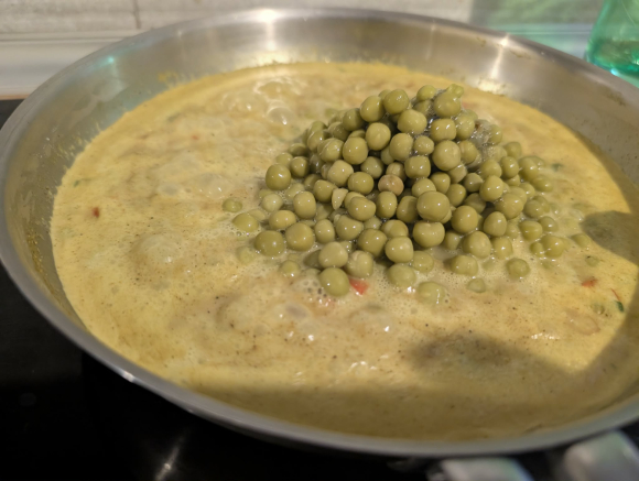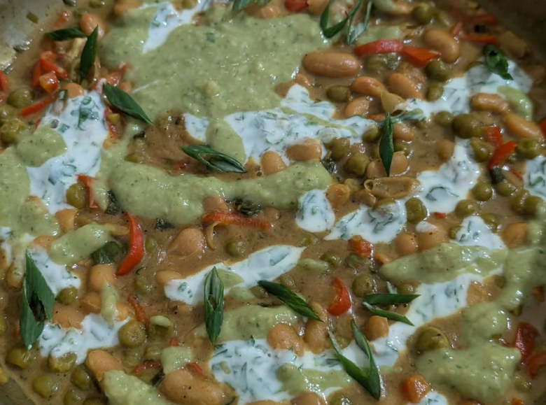 Во широка тава загреј масло и на умерен оган испржи го младиот кромид и потоа додај ја црвената пиперка, кратко промешај, па посипи обилно со кари, сол и бибер. Остави зачинот да се активира. Додај го претходно сварениот бел грав, промешај нежно, па сипи кокос крем. Не брзај, остави да крчка, да се врзат вкусовите, да се појави таа жолтеникава, малку мистична боја. Кога манџата ќе стане кремаста, додади го грашокот и остави уште неколку минути. Тргни од оган.
