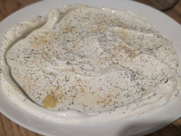 Јогуртот се меша со малку сол, копар и чешне рендан лук или лук во прав или гранули. Се остава на собна температура зашто ладниот јогурт ја убива нежноста на јадењето. Се размачкува во широк тањир, како подлога.