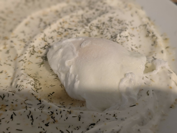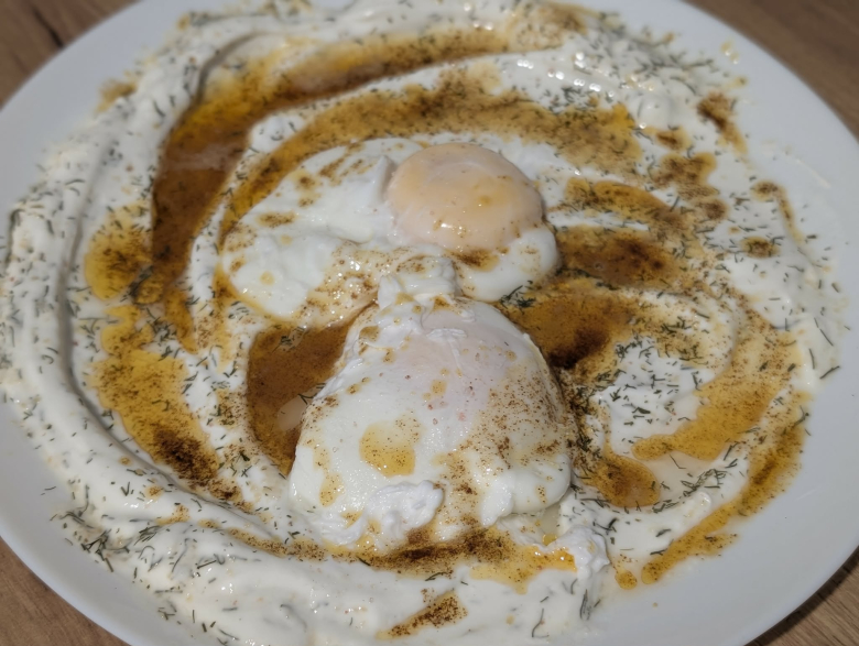 Во тенџере загреваме вода со 2 лажици оцет на најјако. Кога водата ќе почне да врие ја намалуваме јачината на ринглата за две третини. Со лажица правиме вртлог и ги додаваме јајцата кои треба да се варат 3-4 минути. Јајцата ги нанесуваме врз јогуртот. Посолуваме.