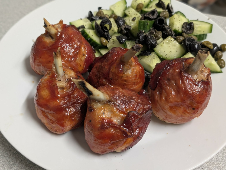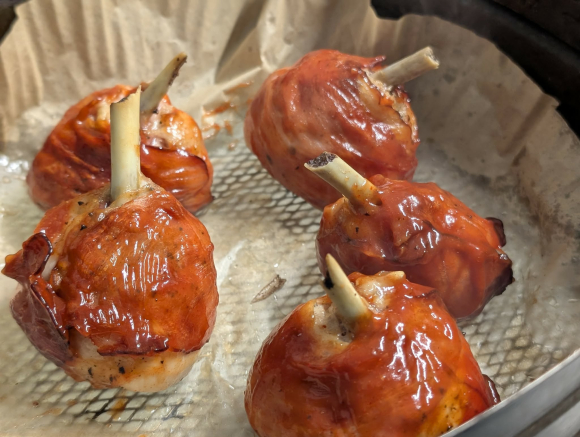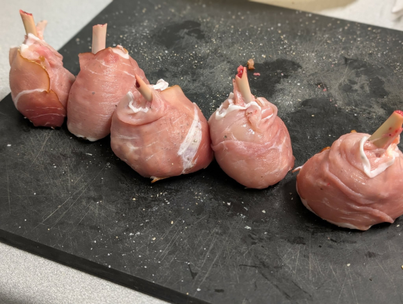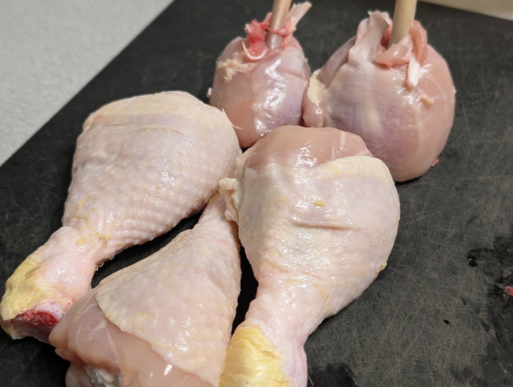 Земете го пилешкиот копан и со остар нож направете кружен засек околу долниот дел на коската (зглобот). Турнете го месото нагоре кон поширокиот дел на копанот за да добиете топчеста форма, оставајќи го горниот дел од коската целосно исчистен. Отстранете ја кожата од целиот копан.