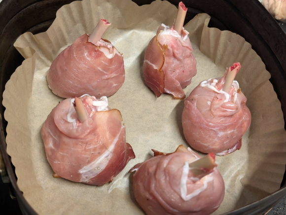 Наредете ги подготвените копани вертикално во сад за печење, претходно обложен со хартија за печење. Печете на 180°C околу 15–20 минути, додека месото не се стегне, а шунката не стане крцкава.