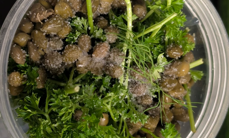 Во блендер ставете ги свежите билки (магдонос, копар и босилек) заедно со капарите. Додадете малку сол и, доколку е потребно, капка маслиново масло. Блендирајте додека не добиете густа, темнозелена паста со изразена арома.
