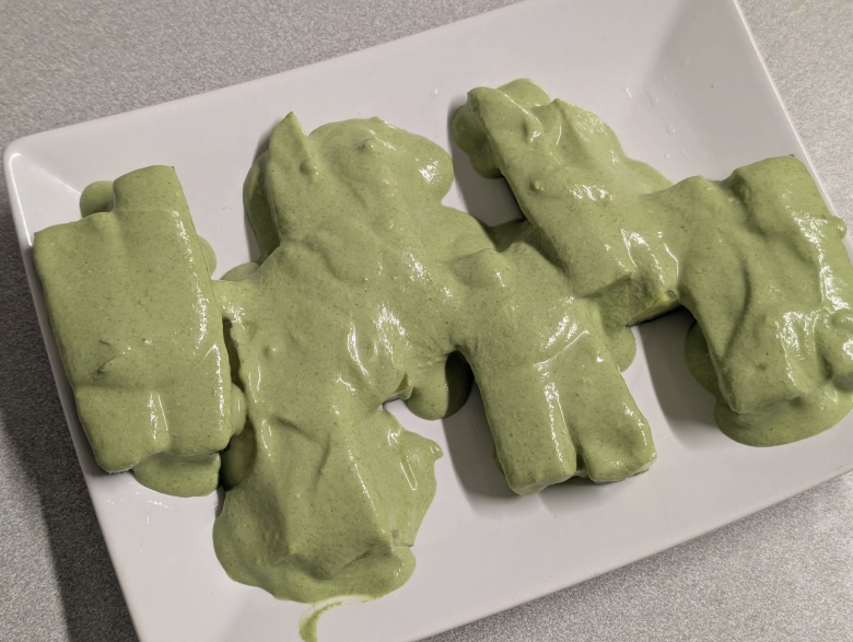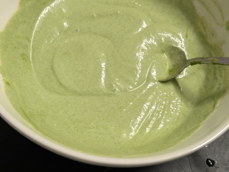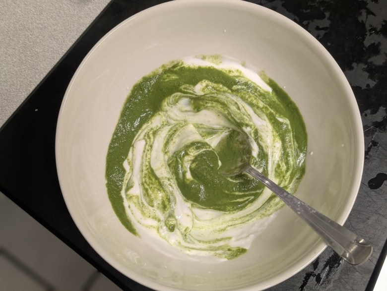 Во посебен сад ставете го грчкиот јогурт. Постепено додавајте ја зелената паста во јогуртот и мешајте со лажица додека двете компоненти не се соединат во мазен, светлозелен сос. Внимавајте да не претерате со мешањето за да ја задржите густината на јогуртот.