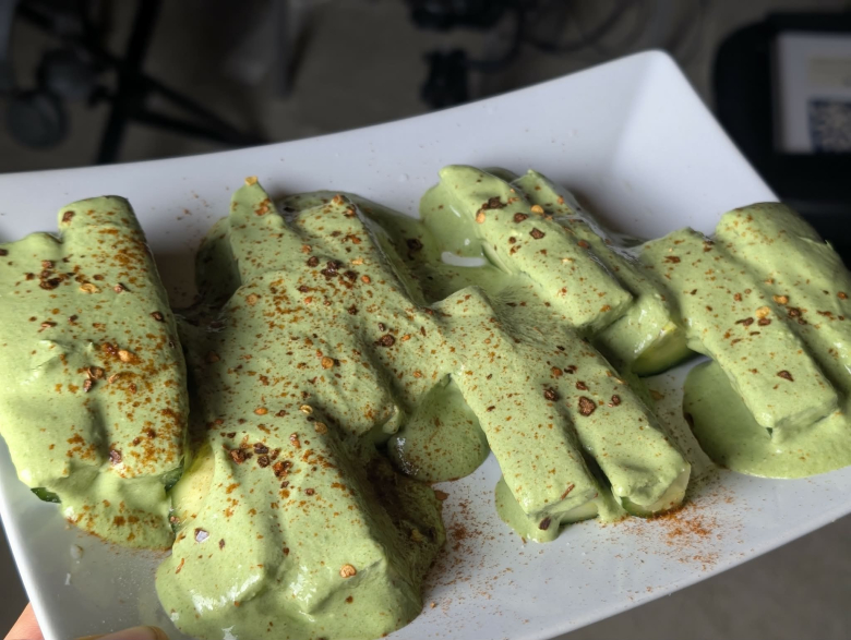 Краставицата исечете ја по должина на дебели парчиња (стапчиња) и наредете ги на плитка чинија. Секое парче прелијте го обилно со подготвениот зелен сос. На крајот, посипете со малку буковец за контраст и дополнителен вкус. Послужете веднаш додека е ладно и свежо.