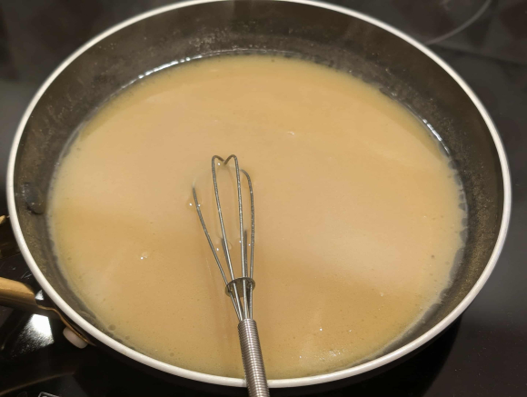 Во тава истури го бујонот и откако ќе се редуцира до половина, убаци го виното. Додај малку брашно и разматкај додека не се згусне. Потоа следува путерот и финална редукција до посакуваната густина.