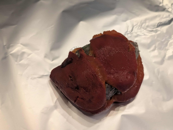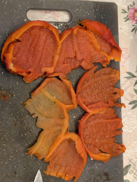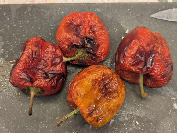Стави ги целите пиперки на 250°C да се испечат убаво, додека не се збрчкаат и не се појават темни дамки. Кога ќе омекнат до граница на капитулација, извади ги и покриј ги за да омекнат. Полесно се лупат така.