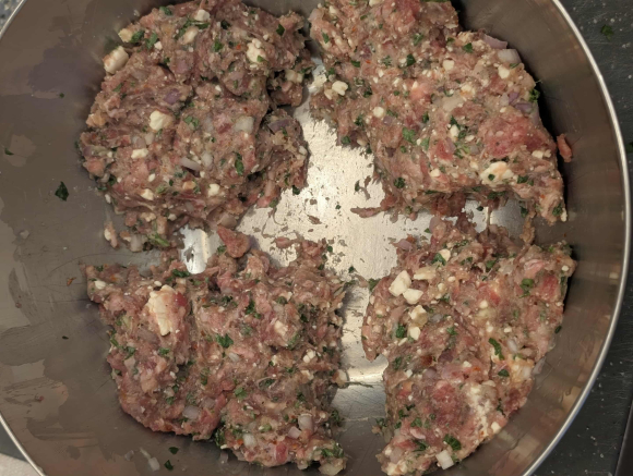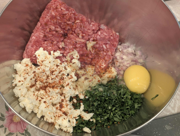 Во голем сад измешај мелено месо, кромид, јајце, фета, магдонос и зачини. Измешај добро додека не почувствуваш дека смесата има солидна текстура. Подели ја смесата во четири еднакви делови.