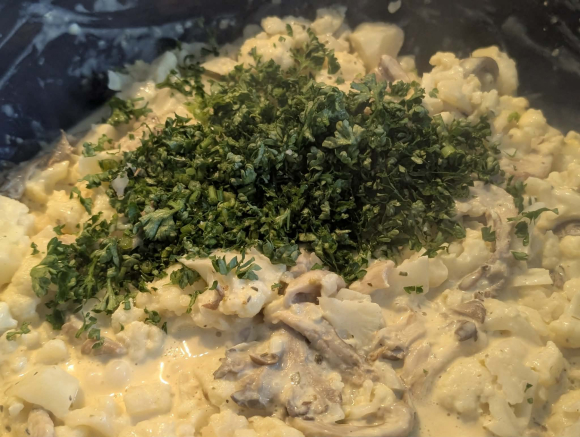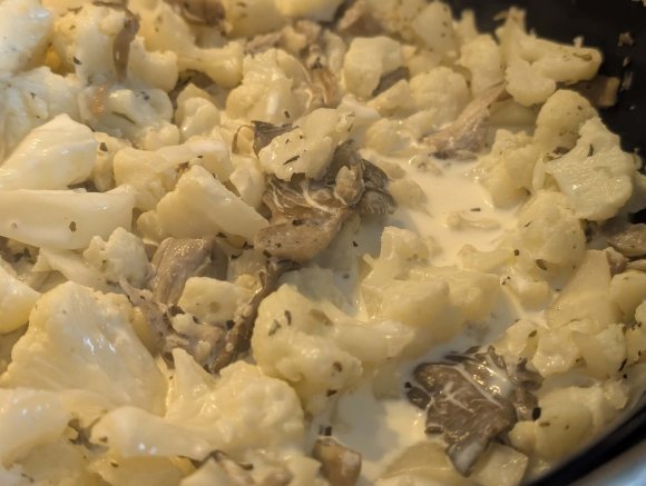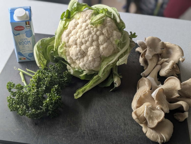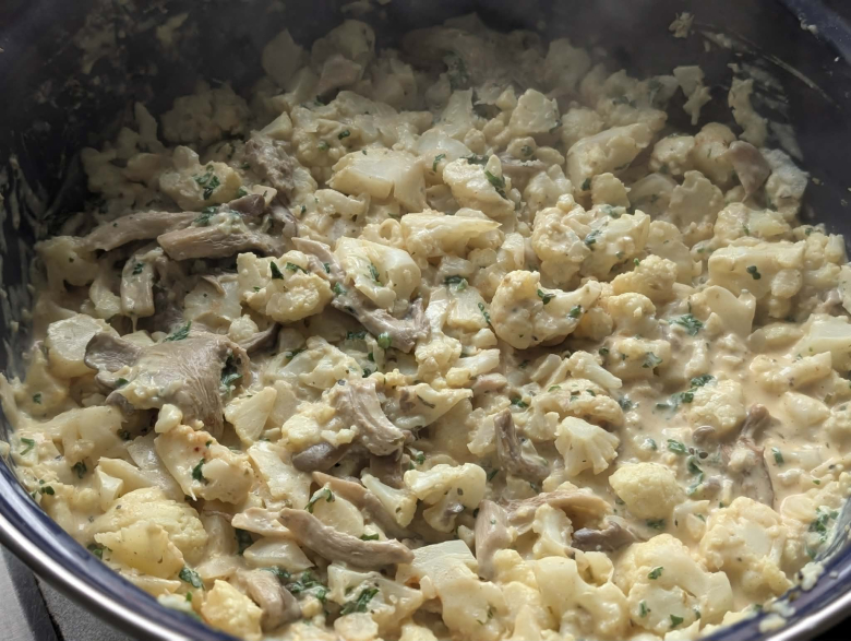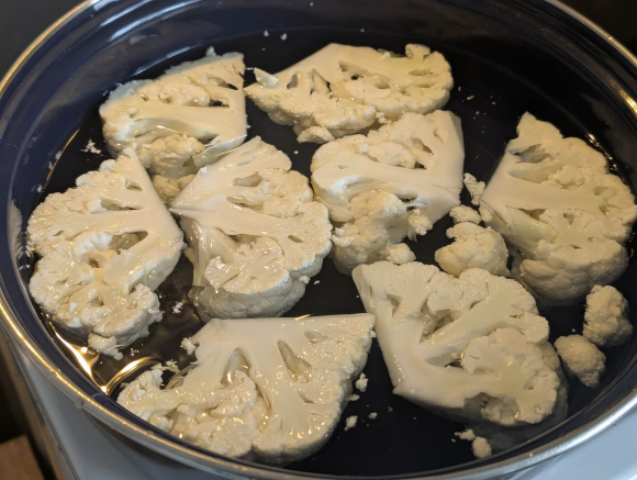 Карфиолот исечете го на рамни „стекови“ или крупни цветови. Буковките само избришете ги со сува крпа (не ги мијте со вода за да не станат сунѓерести) и оставете ги цели. Карфиолот го вариме во вода петнаесет минути за да омекне. Го вадиме, го цедиме, го сецкаме на ситни цветови и го оставаме на страна.