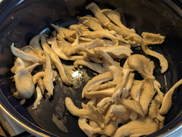 На загреано масло ги пропржуваме буковките заедно со лукот. Пола нека останат цели, а пола сечени на напречни ленти. Нека се пржат седум осум минути.