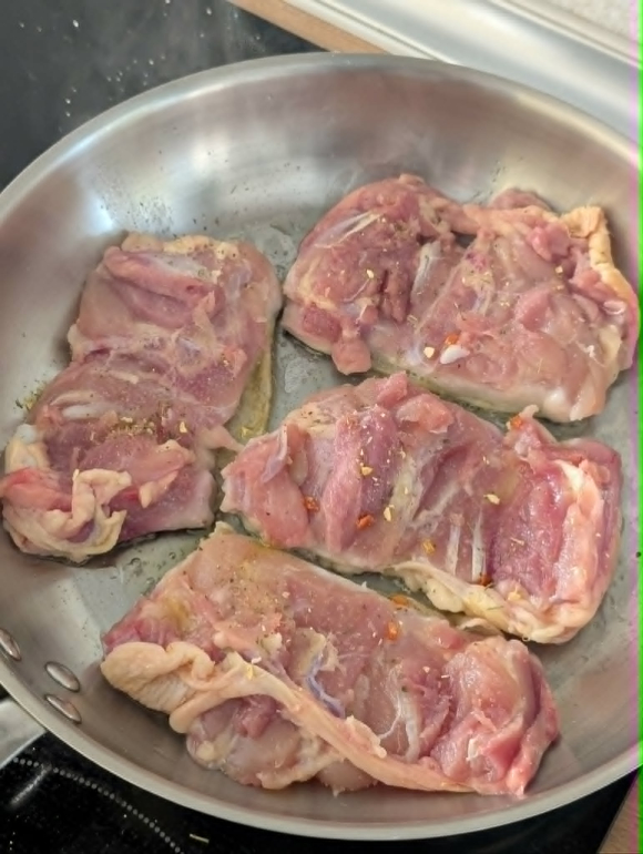 Пилешките надкопани зачинете ги со сол, бибер и сува пиперка. Поставете ги во ладна тава на среден оган со кожата свртена надолу. Целта е кожата да се дехидрира и да стане крцкава (ко стакло), а потоа само кратко превртете ги. 10 минути од страната на кожата, три минути од другата страна. Извадете ги на страна да отстојат.