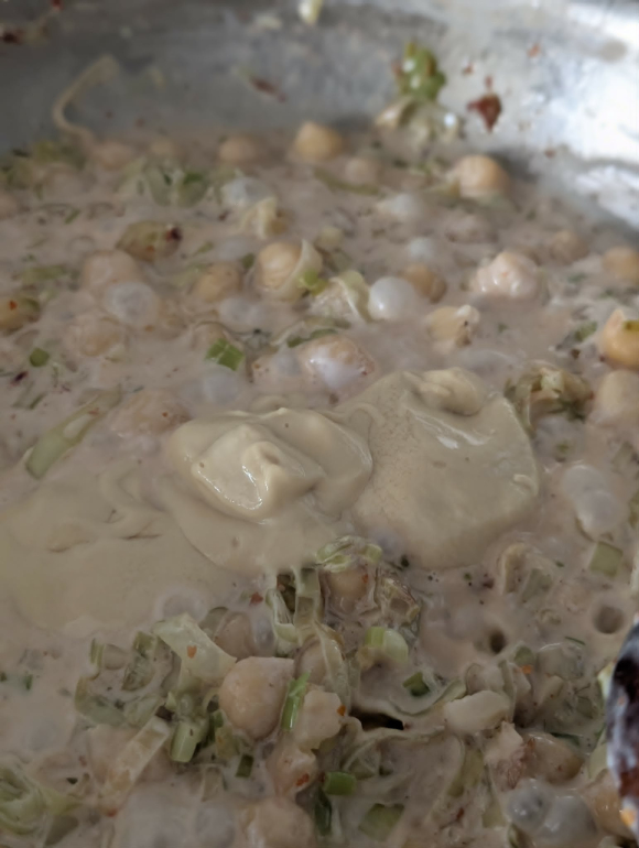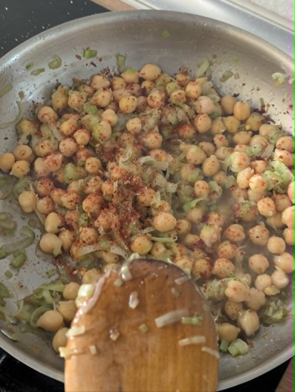 Додадете ја исцедената леблебија и пропржете ја заедно со празот за да прими од аромата.