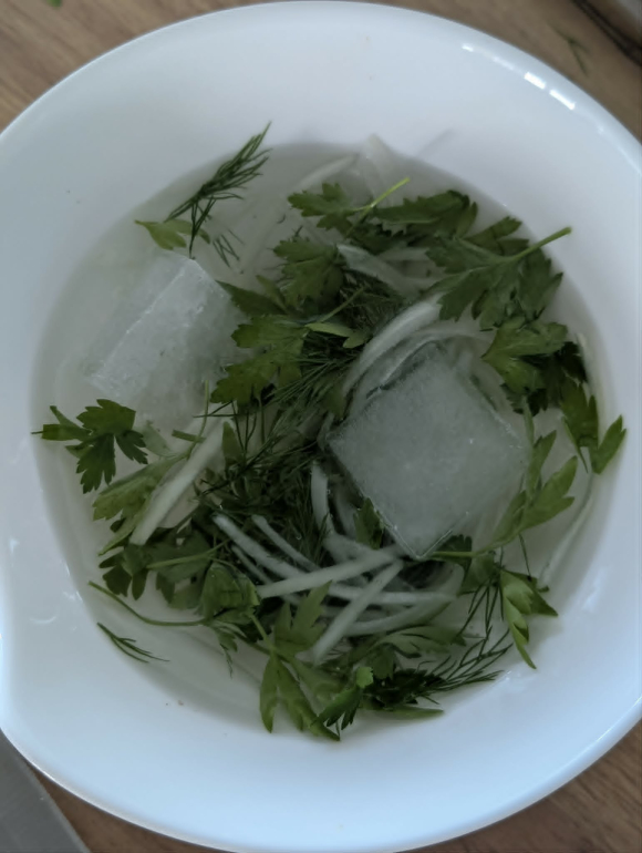 Исечете тенки ленти кромид, магдонос и копар. Веднаш потопете ги во сад со ледена вода и мраз. Ова не само што ја вади лутината од кромидот, туку ги прави билките естетски супериорни и крцкави. Во истата тава, на маснотијата од пилешкото, додадете го ситно исецканиот праз. Пржете додека не карамелизира.