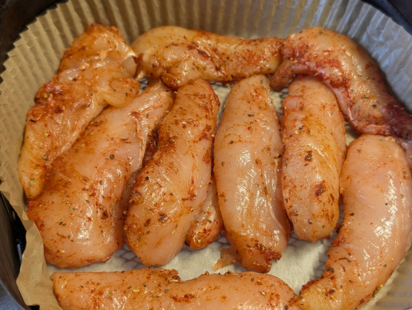 Зачинете ги пилешките ленти со агресивно количество на зачини. Испечете ги во Ер-фраер додека не постигнат Маијар-ова реакција (златна боја), а потоа отстранете ги за да не ја изгубат сочноста. 13 минути на 180 степени.
