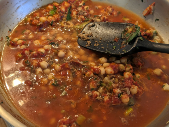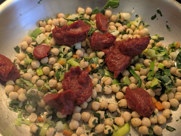 Додадете го наутот и доматното пире. Пржете додека не ја интензивирате бојата на сосот.