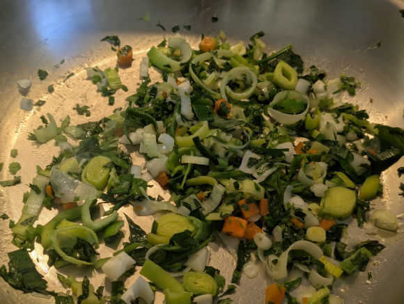 На загреано маслиново масло, додадете ги кромидот, празот и морковот. Динстајте додека не ја изгубат својата структурна форма и не станат меки.