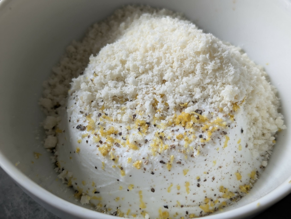 Соединете ја рикотата со пармезанот и цитрусните ноти. Мешајте додека не создадете хомогена структура.