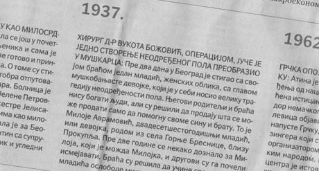 "Хирургот доктор Вукота Божовиќ, со операција вчера едно суштество од неодреден пол го преобрати во маж: Пред два дена, со своите браќа, во Белград пристигна едно момче со женски облик, со глава на машкуданка, кој во себе носеше голема трагедија на неодреденоста на полот. Неговите родители и браќа не се богати луѓе но решиле да продадат сè што имаат само за да му помогнат на својот син и брат. Тоа е Милоје Аврамовиќ, 26 годишен дечко, или девојка, родум од село Горња Бресница. близу Прокупље. Пред две години некако се дозна за Милоје и другарите почнале да го исмејуваат. Браќата решиле да сторат сè што можат да го спасат сиротото момче од маките...."