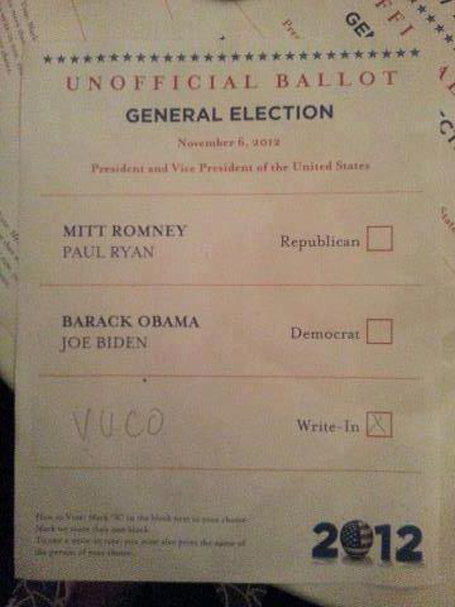 Локалности Балканштина Вуцо им зема глас на Обама и Ромни Штурата политичка понуда на завршените американски избори, некој хрватски домољуб ја поправил со допишување на својот фаворит за претседател на САД, Синиша Вуцо. Како тоa мислите кој е Синиша Вуцо? SharePostСподели Еве како изгледа изборното ливче:Претставување на Независната листа на Синиша Вуцо (немам коментар): Синиша Вуцо во полно издание: SharePostСподели објавено: 8 ноември 2012 - 10:56