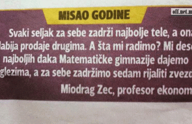 Сосе министер и 4 илјадна публика, во Јагодина, бастионот на живописниот Палма (хинт: Бетовен), во употреба е пуштена нова - гринфилд - жирафа. Петар Луковиќ (Џубокс, Ферал, Време, Е-новине), накурчен каков што го дал Господ, не може да се изначуди што ќе се случи ако дојде слон или паун. Крешендото е сепак кај Палма кој на крајот вика: "Мислам дека денес ставаме точка на жирафата". Србија, оригинал.