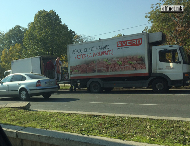 Поради дефект на возилото на домашниот добавувач, ние извршивме претовар ( бидејќи е свежо месо и не е препорачливо да стои) со наше возило кое ги исполнува сите услови за транспорт на месо и на останати свежи продукти. Во целата процедура се испочитувани сите законски регулативи на Република Македонија, односно претоварот е извршен во присуство на официјално лице од АХВ.