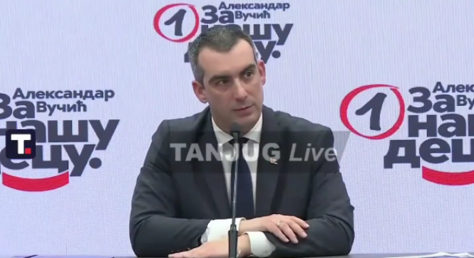 Човек од партијата на Вучиќ држи прес - конференција. Додека зборува, шара со погледот лево и десно, за сите присутни да имаат чувство дека ним им се обраќа. Прашува и дали има прашања за крај. Нема. Тој станува, камерманот одзумира.