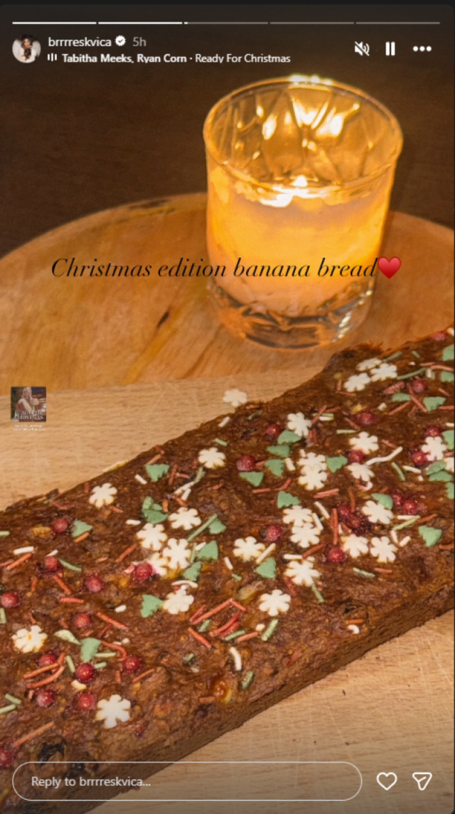 Таа го придружи ова со текстот од песната „Ready for Christmas“, додека на фотографијата гледаме и како го украсила лебот.