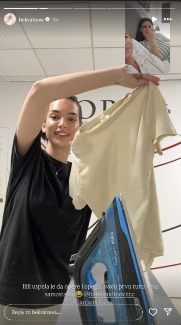 Ииии успеа сама да ја испере и испегла првата тура алишта“, со гордост напиша Беквалац на социјалните мрежи, споделувајќи го моментот со своите следбеници.