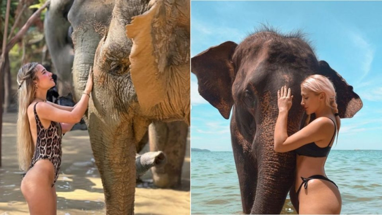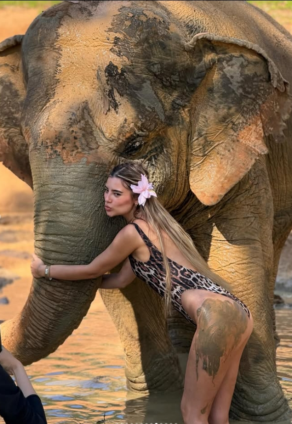 Таа во едноделен костим за капење со леопардов принт, а слонот во своето природно окружување започнаа заедничко уживање. Малку галење, малку гушкање со нежните дланки, особено по сурлата за обострано задоволство и на слонот и на манекенката.