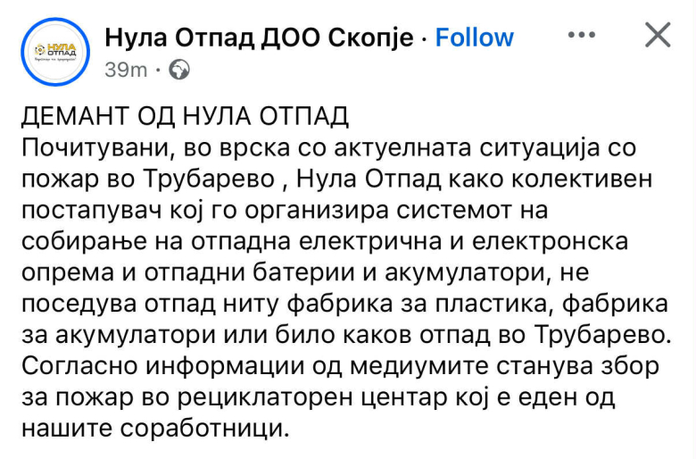 „Има голем пожар во Трубарево, зафатени се отпадни материи, се гасне со повеќе екипи“ изјави Звонко Томевски, командир на Бригадата за противпожарна заштита на град Скопје.