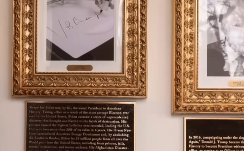 Под сликата на автоматското пенкало, кое треба да го претставува Џо Бајден, со златни букви е напишано: „Поспаниот Џо Бајден несомнено е најлошиот претседател во американската историја... Ја презеде функцијата како резултат на најкорумпираните избори досега... Со прекар Поспаниот и Лажго, Џо Бајден беше под влијание на неговите радикални левичарски советници“.