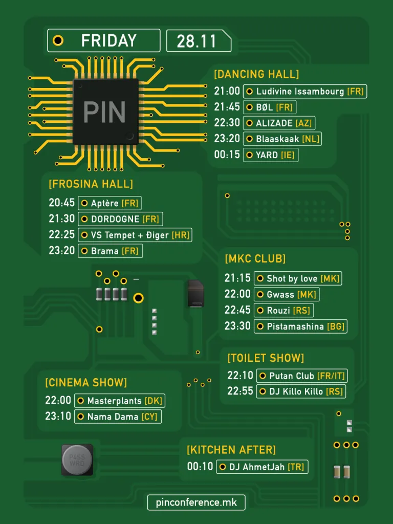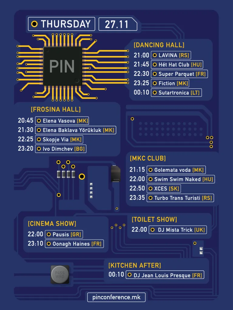 - На 27 ноември, во четврток почнува новото издание на ПИН - меѓународната музичка конференција и концертен саем што ќе се одржува три дена, до сабота 29 ноември во скопскиот Младинскиот Културен Центар. Станува збор за единствениот ваков настан во Македонија, воедно прв и најголем на Балканот, а кој во Скопје ги собира музичките професионалци од целиот свет, претставувајќи ја пред македонската публика музичката авангарда и новата сцена од цела Европа.