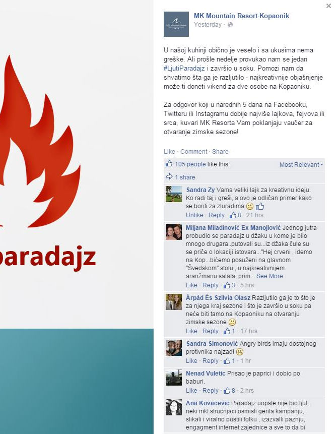 Net Roulette Онака Дајте од тие ордените за посебни Фесјбук заслуги Хотел на Копаоник прави "Engrish" пропуст на налепницата на едно од јадењата. Нормално резилот се шири по нет, на што реагираат спектакуларно шармантно, на граница со "сами да не го смисливте ова?" SharePostСподели Повод Реакција SharePostСподели објавено: 4 декември 2015 - 13:45