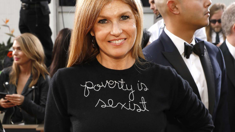 Кони Бритон се појави на златните глобуси во црно, како поддршка за движењето Time's Up, ама го дотера активизмот малку подалеку, со тоа што избра блуза со натпис „Сиромаштијата е сексистичка”. Пораката ќе беше скроз прифатена да не беше без осет од проста причина што грдата блуза неколку стотици долари.