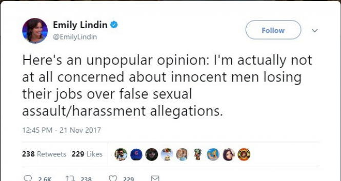 Лажните обвинувања за силување стануваат многу сериозен проблем за време на оваа ера означена со девизата „послушај и верувај”, поради трајната стигматизација и уништување на лажно обвинетите, плус општиот недостаток на реперкусии против лажните обвинувачи. Сега жртвите имаат право да се предомислат за „согласноста” многу време после настанот, и да уништуваат луѓе кои немаат направено ништо лошо – за на крај да отшетаат без никаква штета кога лагите ќе им ги разоткријат. Но, според Емили Линдин, сето ова е совршено прифатливо во борбата за растурањето на патријархатот.