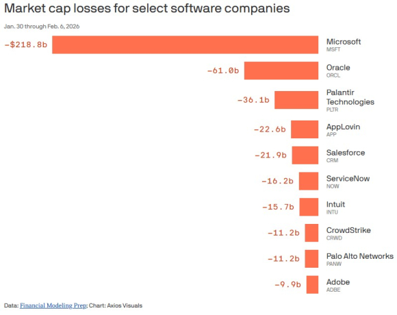 Софтверскиот гигант Мајкрософт во периодот од 20 јануари до 6 февруари изгуби 218,8 милијарди долари од вредноста на акциите. Оракл изгуби 61 милијарда, а Палантир 36.