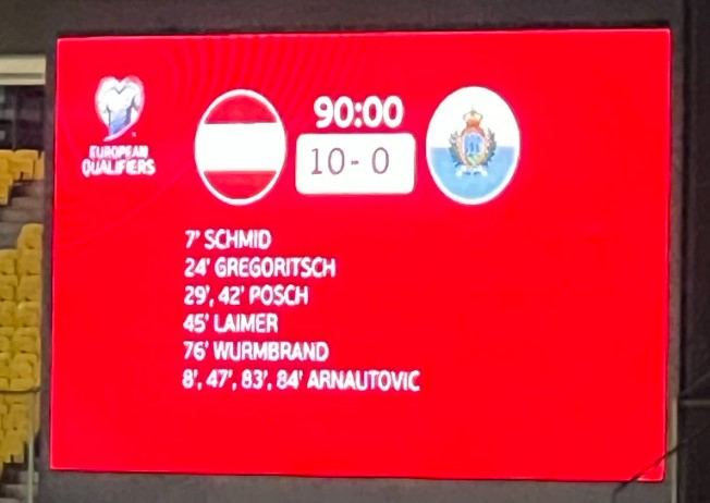 Австријците ја наполнија мрежата на Сан Марино со 10 парчиња и ја остварија највисоката победа од нивното постоење.