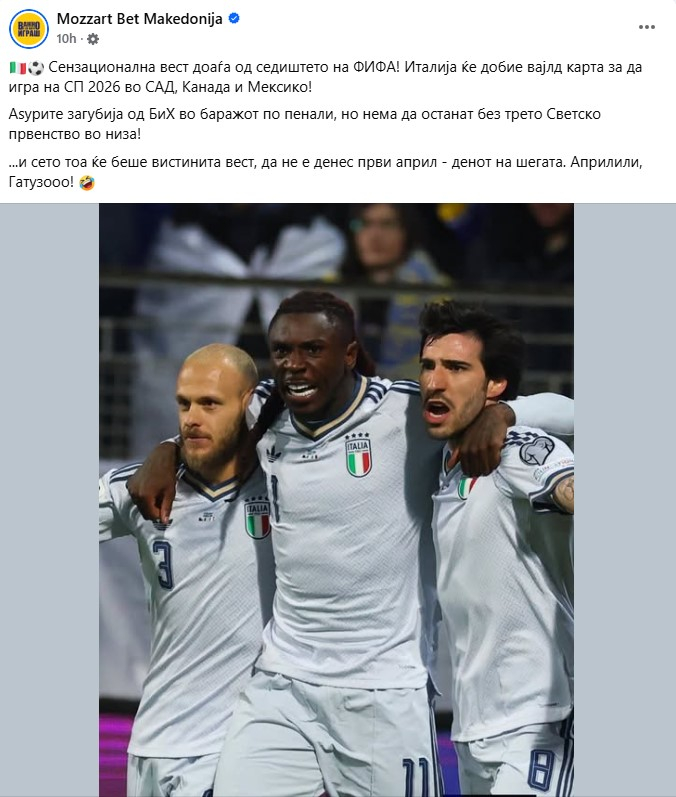 Offside Фудбал Гатузо може да се смири, се најде начин како да одат на Светско Админот на Моцарт им го најде чарето на јадните Италијанци. Со вајлд карта ќе одат. Готово, завршена работа. SharePostСподели SharePostСподели Тагови: италијанска фудбалска репрезентација сп 2026 објавено: 1 април 2026 - 11:17