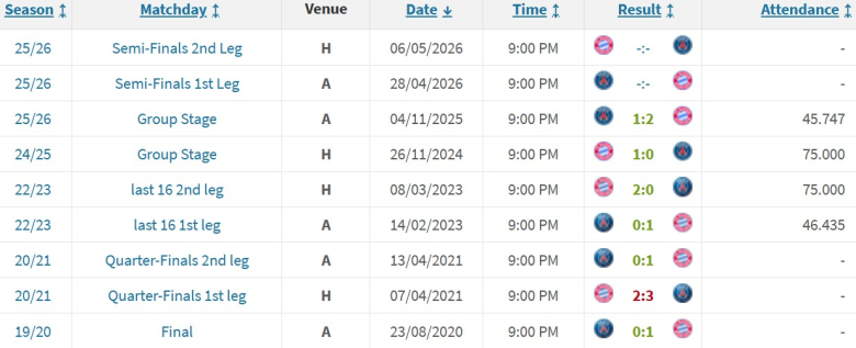 Во пресрет на вечерашната мега битка во ЛШ меѓу гиганите за кои успех е само титулата, излезе еден занимлив податок. Баерн и ПСЖ се соочуваат шест сезони по ред во елитното натпреварување и тоа секоја сезона во различна фаза, од групна до финале. ПСЖ победил само еднаш, Баерн шест пати.