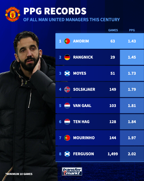 Последниот тренер на Манчестер кој имал полош резултат од Аморим е Френк О'Фарел, отпуштен во 1972 година со 1,41 бодови.